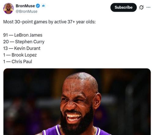 同時本場是詹姆斯37歲后第91次單場拿下30+得分表現(xiàn),繼續(xù)斷檔占據(jù)NBA歷史第一,庫里以20次排在第二。