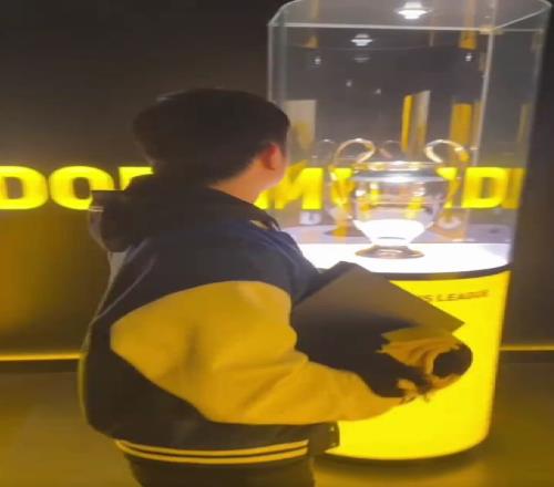 比賽開始之前,波爾帶著樊振東去多特蒙德的獎杯陳列室參觀,首先映入眼簾的是歐冠獎杯,1997年多特蒙德。在1997年歐冠決賽,多特蒙德在慕尼黑奧林匹克球場以?3-1戰(zhàn)勝尤文圖斯?,首奪歐冠冠軍,也是德甲歷史上除拜仁外唯一奪得過歐冠的球隊。