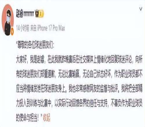 第二條消息來自于趙睿,2月2日晚間他在網(wǎng)上發(fā)出道歉信,對于輸給青島隊(duì)賽后回復(fù)網(wǎng)友的不理性言論道歉。