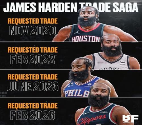 哈登被曝申請離隊(duì)美媒曬四次交易申請圖:哥們兒在哪都不開心