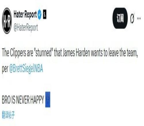 該美媒寫道:“快船非常震驚哈登想要離開球隊(duì),這兄弟從來都不開心”。
