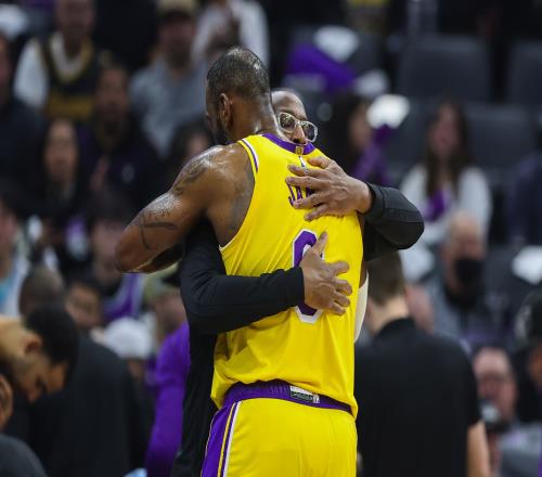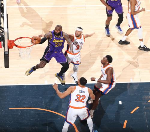詹姆斯穿著一件黑色的湖人T恤,吃著花生醬和果醬三明治。他的妻子薩萬(wàn)娜在走廊里耐心地等待:在尼克斯以112-100擊敗她丈夫所在的球隊(duì)后,她是第一位到達(dá)更衣室外的湖人親友。