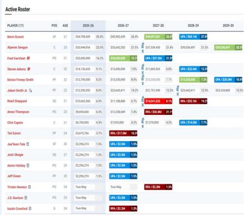 火箭隊目前大名單上是14+3,火箭隊距離第一硬帽只差125萬,這也是火箭競爭托馬斯失敗的一個要因,可拉塞爾的負面消息太多,除了火箭這種特別欠缺控球后衛(wèi)的球隊才會追求,火箭隊最多也只能給125萬的底薪。