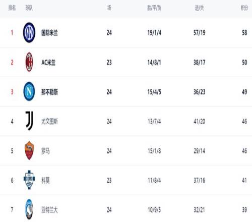 在積分榜上,國(guó)際米蘭以58分排名榜首,戰(zhàn)績(jī)是19勝1平4負(fù)。國(guó)際米蘭雖然輸球的場(chǎng)次不算少,但平局極少,贏球的場(chǎng)次聯(lián)賽最多,讓國(guó)際米蘭得以占據(jù)第1的位置。AC米蘭只拿到50分,排名第2,足足落后了8分。不過,A米蘭少踢1場(chǎng)。