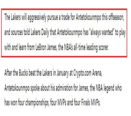 北京時間2月10日,根據(jù)美媒LakersDaily的報道,湖人將在休賽期積極尋求交易得到揚尼斯·阿德托昆博。消息人士告知,阿德托昆博一直渴望與NBA歷史得分王勒布朗·詹姆斯并肩作戰(zhàn)并向他學習。