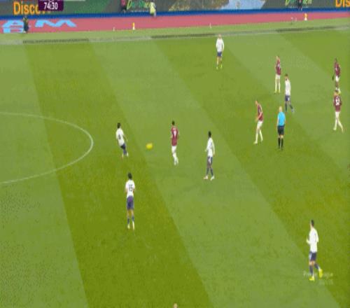 到了這個(gè)時(shí)候,此前在一周一賽時(shí)被掩蓋的問(wèn)題就會(huì)浮出水面,比如這次推進(jìn),好不容易打出了速度,但到了弱側(cè),你也不知道是達(dá)洛特傳大了,還是阿瑪?shù)?迪亞洛追不上了,反正一次很好的推進(jìn)變成了西漢姆聯(lián)的門球: