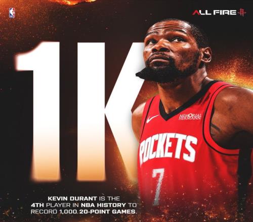 憑借這樣的表現(xiàn),杜蘭特迎來(lái)里程碑,成為NBA歷史上第4位拿下千場(chǎng)20+得分表現(xiàn)的球員,前三人分別是詹姆斯、卡爾馬龍和賈巴爾。