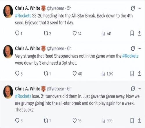 火箭隊(duì)在進(jìn)入全明星周末前戰(zhàn)績(jī)33勝20負(fù),而且在球隊(duì)需要一個(gè)三分球時(shí)烏度卡不讓謝潑德在場(chǎng),火箭單場(chǎng)21次失誤也太糟糕了。杜蘭特也未能出手火箭的絕平一球。