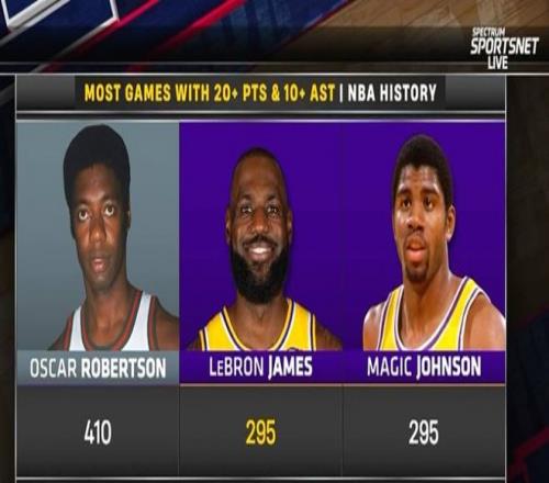 第三,歷史20分10助場次榜:大O以410場排名第一,詹姆斯295場與魔術(shù)師并列第2。
