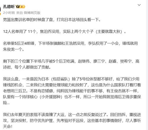 但是在中場的時候,我強調隊員,我們要堅定我們的信念,要相信我們的團隊,相信每個人,相信我們中國男籃這個團隊,從防守做起,一個個防一個個攻,我們每個球員都做的非常好,這種專注力執(zhí)行力,下半場體現得非常好。