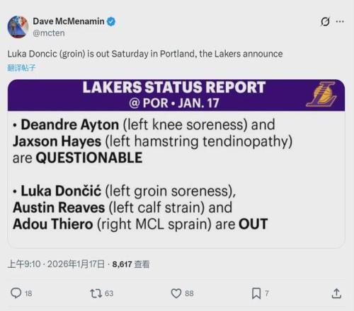 北京時(shí)間1月17日上午9點(diǎn),湖人官方公布球隊(duì)傷病報(bào)告:東契奇(腹股溝酸痛)、里夫斯(左小腿拉傷)、蒂耶羅(右膝韌帶扭傷),將缺席明天和開拓者的比賽。此外,艾頓(左膝酸痛)和海斯(左腿筋肌腱炎)均是出戰(zhàn)成疑。
