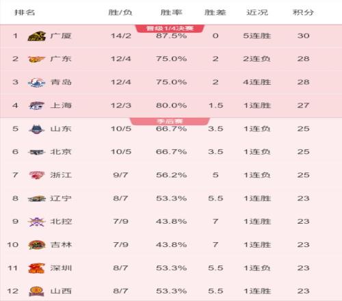 聯(lián)賽積分榜前12名排名:廣廈、廣東、青島、上海、山東、北京、浙江、遼寧、北控、吉林、深圳和山西。