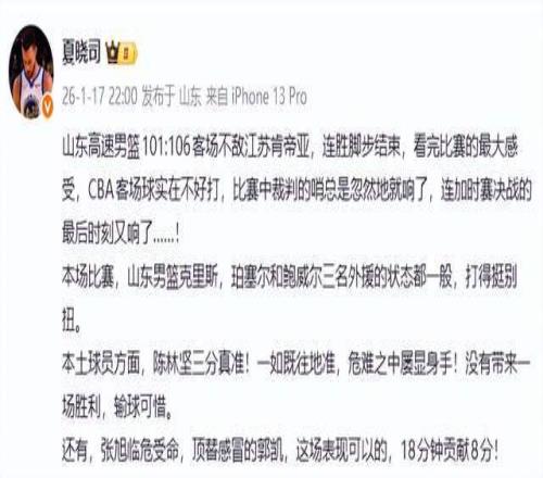作為山東媒體人,夏曉司老師是會這樣說的,“看完比賽的最大感受,CBA客場球?qū)嵲诓缓么颍荣愔胁门械纳诳偸呛鋈坏鼐晚懥?,連加時賽決戰(zhàn)的最后時刻又響了……”顯然,他覺得是裁判的問題。