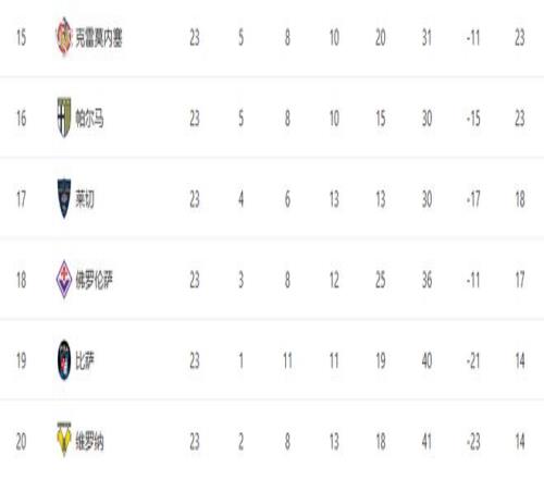 保級區(qū)方面,克雷莫內(nèi)塞和帕爾馬同積23分,均領(lǐng)先降級區(qū)6分,形勢相對安全;而萊切輸球后積18分,僅僅只比降級區(qū)多1分。