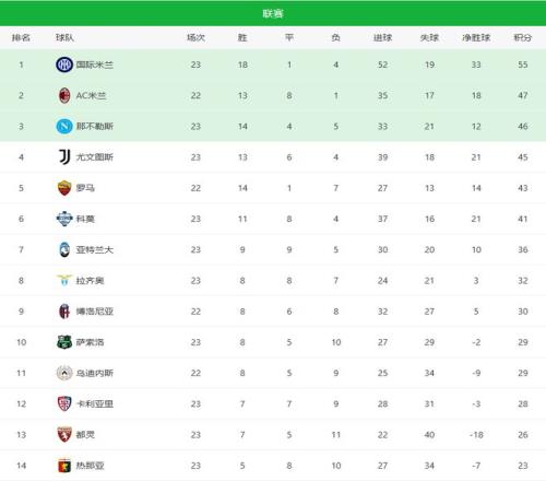 國際米蘭55分穩(wěn)居榜首,領(lǐng)先優(yōu)勢擴大到8分;尤文45分位列第一集團;那不勒斯排名第3,但已落后國米9分,追趕難度不小。