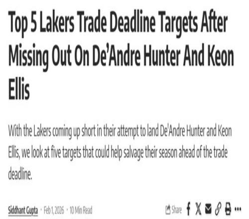 但無論原因如何,結(jié)果是湖人錯(cuò)失兩大心儀目標(biāo),這筆交易達(dá)成后也讓紫金軍團(tuán)后續(xù)補(bǔ)強(qiáng)前景變得再度模糊起來。