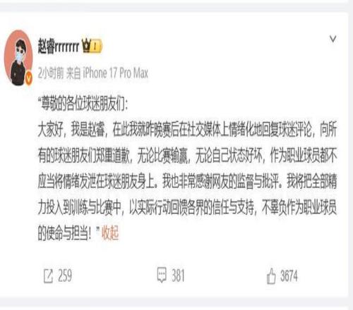 趙睿這波爭(zhēng)議言論影響非常惡劣,傷害了新疆球迷,2月2日晚,意識(shí)到事件嚴(yán)重性的趙睿,在個(gè)人社媒上發(fā)表了公開致歉,表示:“向所有的球迷朋友們鄭重道歉,無(wú)論比賽輸贏,無(wú)論自己狀態(tài)好壞,作為職業(yè)球員都不應(yīng)當(dāng)將情緒發(fā)泄在球迷朋友身上”。