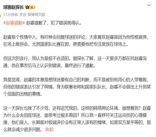 趙探長(zhǎng)認(rèn)為:趙睿犯了錯(cuò)就得認(rèn),這一天多方都在找趙睿溝通,他已經(jīng)意識(shí)到了錯(cuò)誤,趙睿的本意是想球迷要有自己的判斷,而不是被別有用心的人帶著跑,但他的錯(cuò)誤表達(dá)引發(fā)了輿情。