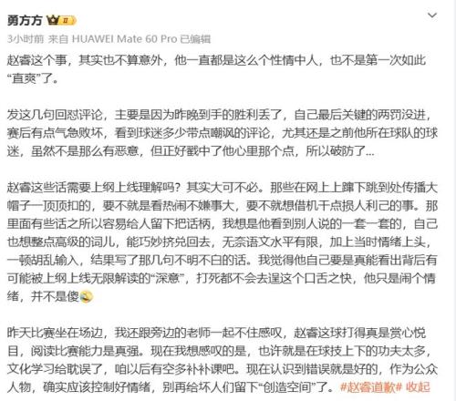 公開道歉一出,不少北京的媒體人也紛紛為趙睿說(shuō)好話,洗脫罪名,勇方方表示:趙睿是性情中人,語(yǔ)文水平有限,輸球鬧情緒逞口舌之快,結(jié)果寫幾句不明不白的話,網(wǎng)友也大可不必上綱上線,扣帽子。