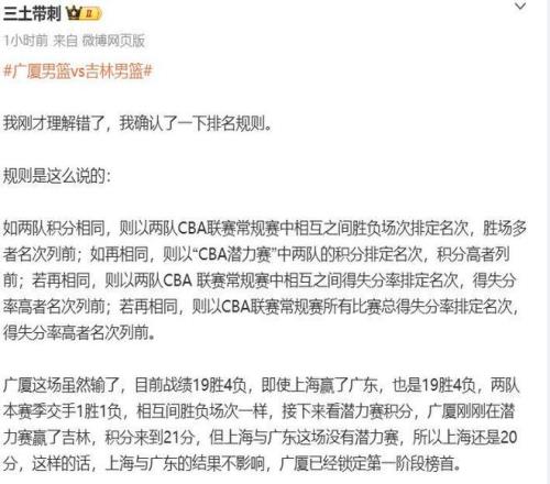 簡(jiǎn)單來(lái)說(shuō),本賽季新增了潛力賽,所以排名的規(guī)則也有所改變,雙方積分相同,要先看潛力賽積分,然后在對(duì)比兩隊(duì)互相之間的得失分率,常規(guī)賽一番戰(zhàn)廣廈贏上海7分,二番戰(zhàn)廣廈輸20分,但廣廈一階段的潛力賽打的多,7勝7負(fù)積21分,上海9勝2負(fù)積20分。