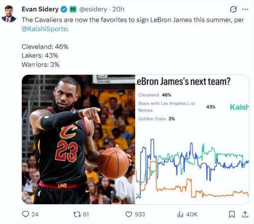 北京時間2月17日,《福布斯體育》記者埃文-斯迪瑞根據(jù)數(shù)據(jù)媒體Kalshi的統(tǒng)計曝出了勒布朗-詹姆斯今夏潛在下家的概率:騎士46%、湖人43%、勇士3%。