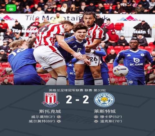 北京時(shí)間2月21日英格蘭足球冠軍聯(lián)賽 聯(lián)賽 第33輪,斯托克城主場(chǎng)對(duì)陣萊斯特城。斯托克城威爾莫特梅開(kāi)二度。萊斯特城穆卡薩破門,溫克斯建功。最終比分斯托克城 2-2 萊斯特城。萊斯特城遭遇7輪不勝,仍然位居英冠降級(jí)區(qū)。